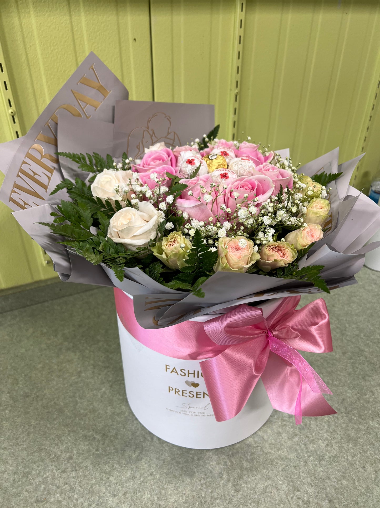 send beautiful crafted flowers in a box to yours loved ones. A round box filled with pretty flowers and sweet chocolates.